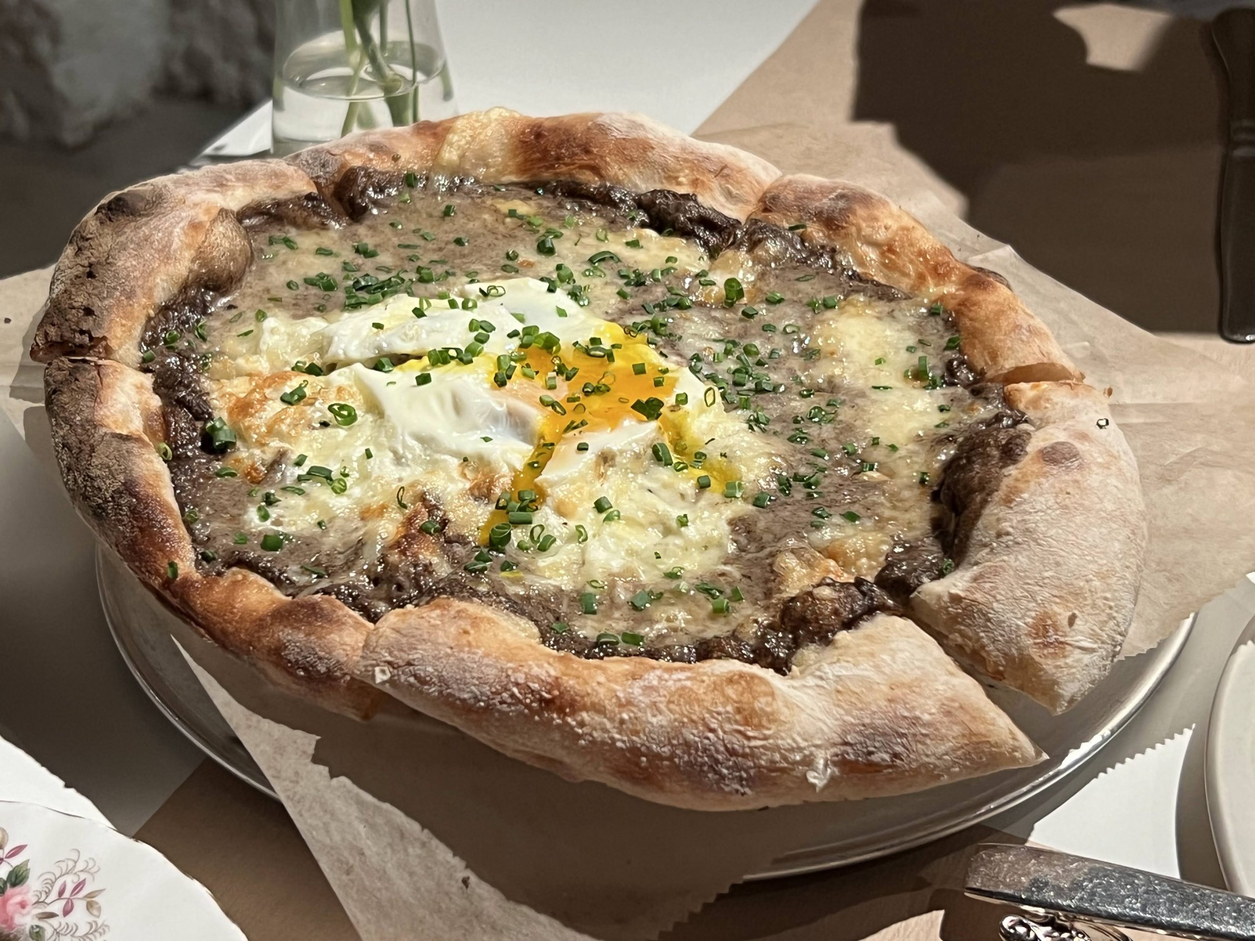 チーズたっぷりに半熟卵がのったトリュフのピザ。これがめちゃくちゃ美味しかった!