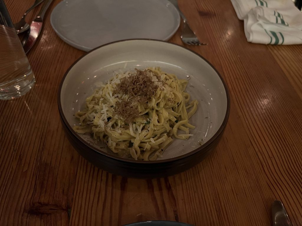 もう少し何か食べたいと思って追加した一品。パスタですが一応前菜です。トリュフがとってもいい香り。バターとパルメザンチーズが濃厚でした。でもパスタはイタリアンで食べる方がいいですね。