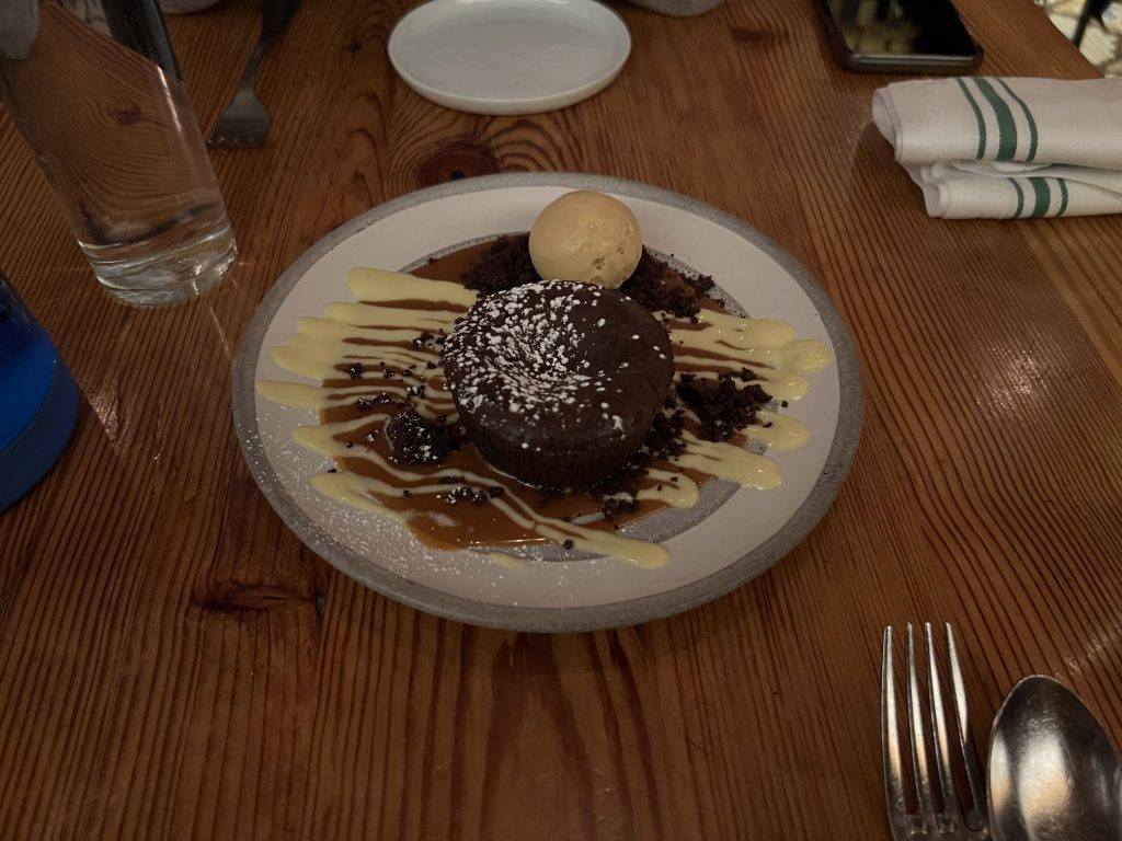 もちろん食後のデザートは別腹!小麦粉不使用のとの事ですが、しっとり濃厚なチョコケーキで、カスタード風味のソースやキャラメルアイスと一緒に食べても甘すぎず美味しい!こちらも一瞬で完食です。