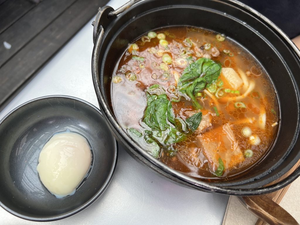 お皿で提供されるメニューもあるようですがこちらも鉄鍋で出てきました。一口目からダイレクトに辛さを感じる旨辛肉うどん。ゴロっとした牛肉の他に、モツのような内蔵系のお肉とコラーゲンのようなプルプルしたお肉が入っていました。