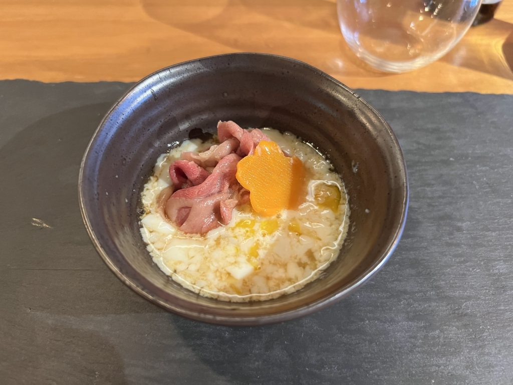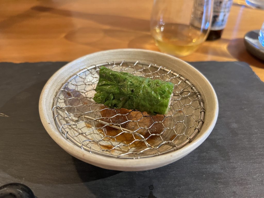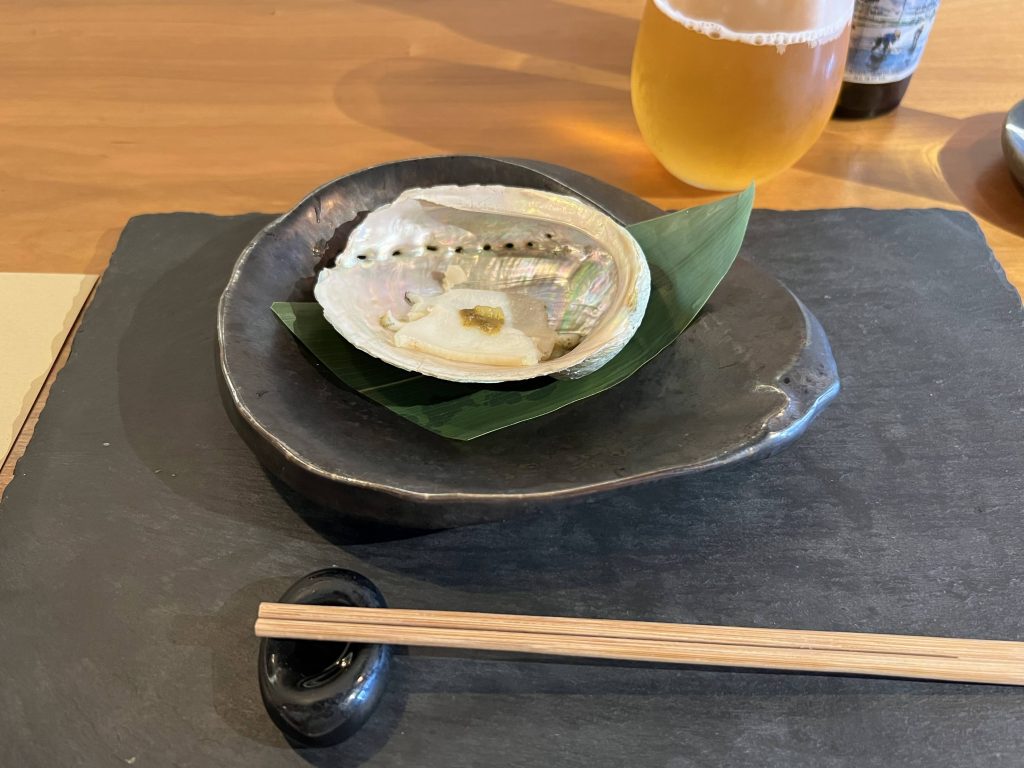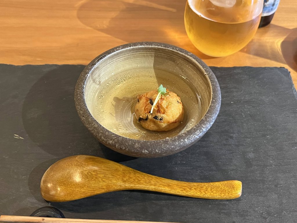 一品目はアワビと柚子胡椒。二品目はがんもどきが出てきました。どちらも美味しく、久々に食べたがんもどきは特にお出汁が沁みる一皿です。