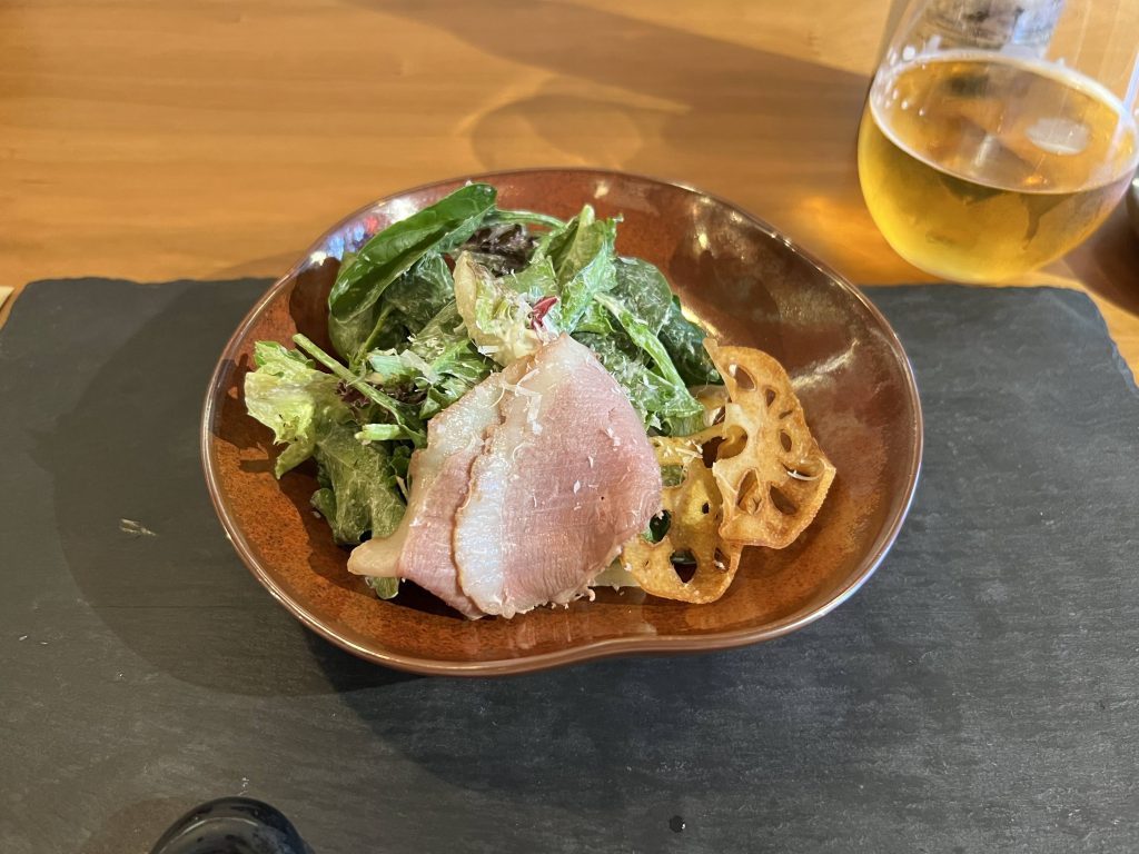 三品目は湯葉とウニ。ミルキーな二つの組み合わせが最高に美味しく贅沢な一口です。四品目はレモン麹のシーザードレッシングが目新しい。自分で作るとなると面倒なレンコンチップスがあるのも嬉しい!