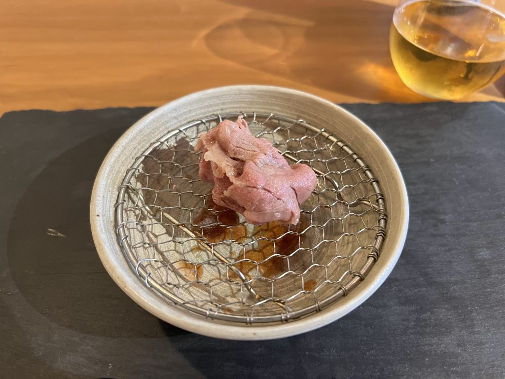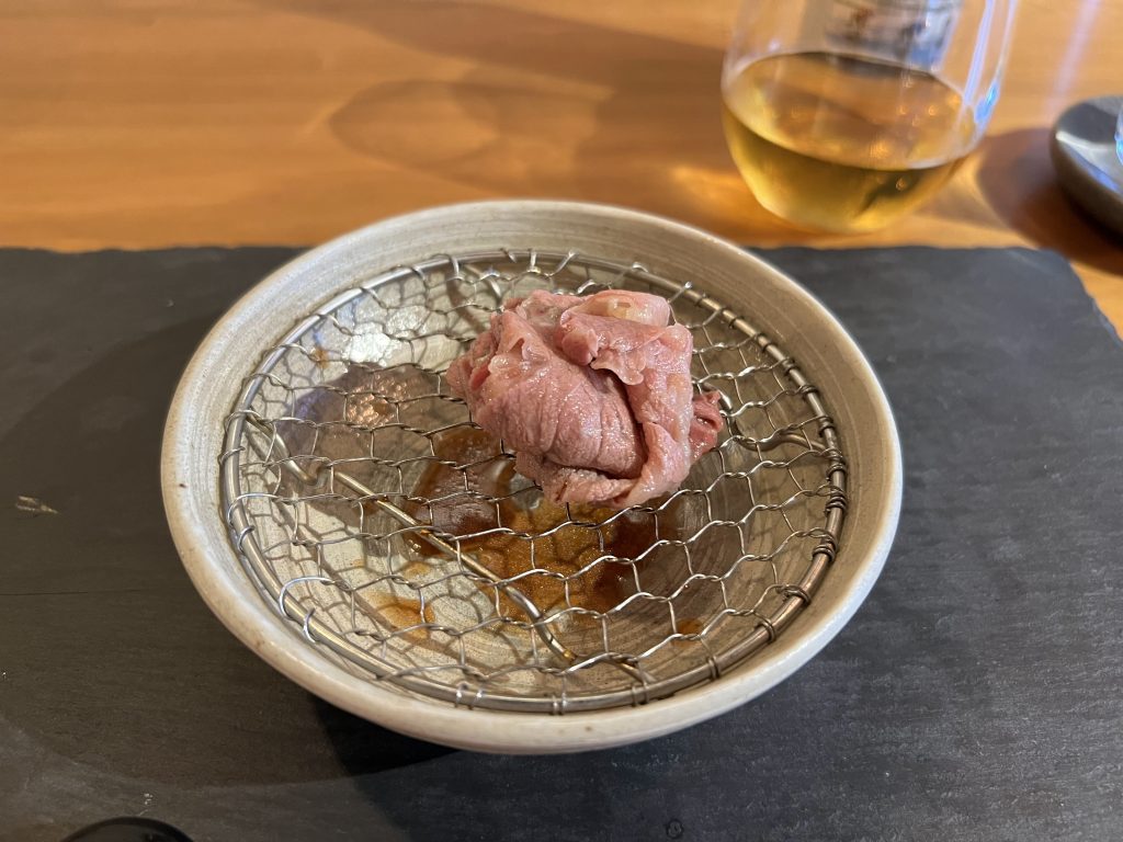 豚バラ肉の辛汁と味噌ソースをつけたもの。次に和州牛のポン酢。テンポよくお肉が出てきてお酒が進みます。