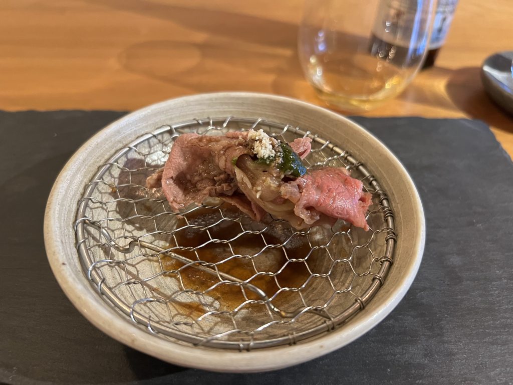 次に出てきたのがレタスの豚バラまき。辛汁とトマトソースで味付けされています。次は和州牛の辛汁とアンチョビガーリックソース。これまで和風な味付けだったのに一変して洋風な味わいに!新しい組み合わせの発見とお口直しになりました。